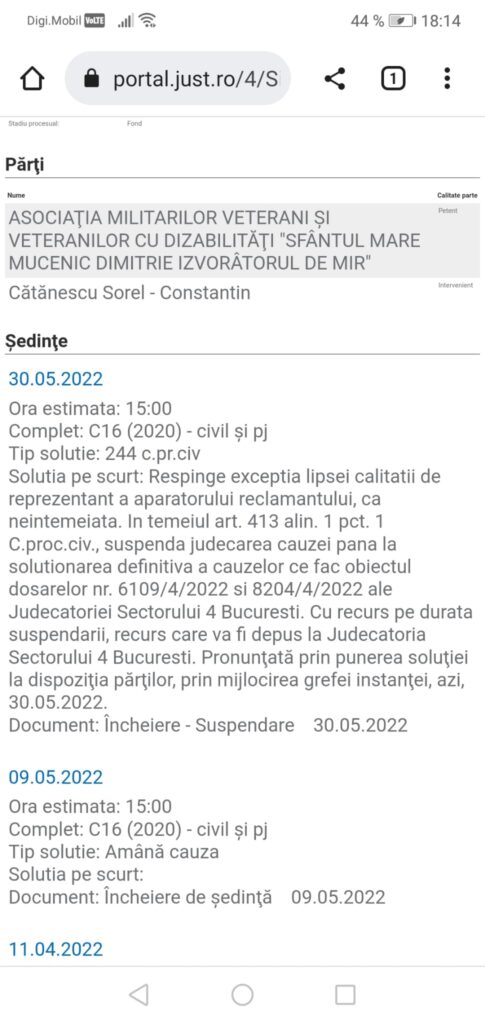 Analizând solicitările, Judecătoria Sectorului 4 le-a găsit pertinente, drept pentru care a decis suspendarea cererii de înscriere a modificarilor survenite în cadrul Adunarii Generale a asociaților până la soluționarea definitivă a cauzelor privind ordonanța președențială și anularea Procesului Verbal al Adunării Generale din data de 26.02.2022, solicitate în dosarele aflate pe rolul Judecătoriei Sectorului 4 București, cu nr. 6109/4/2022 respectiv 8204/4/2022.