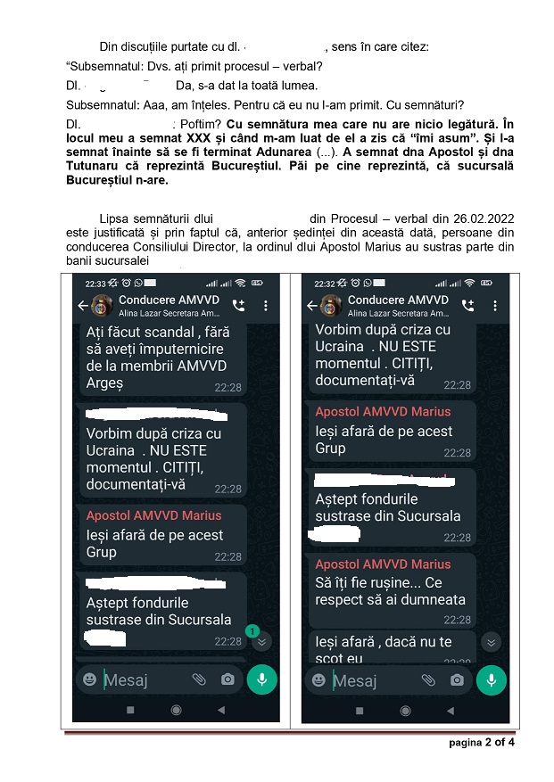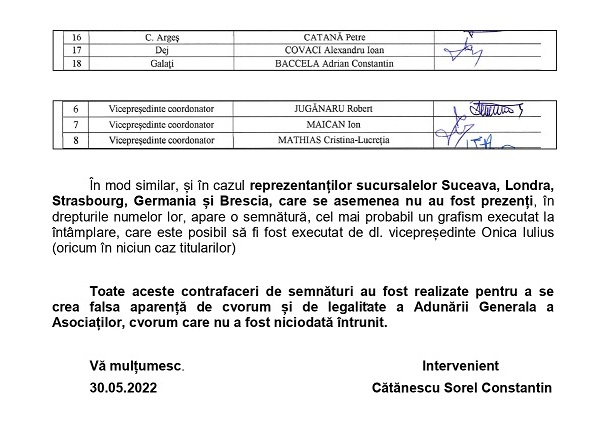 Asa cum spuneam, se pare că decizia de astăzi a instanței are legătură și cu ”Cererea de înscriere în fals” împotriva Procesului-Verbal al Adunării Generale din 26.02.2022 (a cărei înscriere se cere), depusă de dl. Cătănescu Sorel, prin care acesta sesizează mai multe semnături în fals pe Procesul Verbal depus la instanță, comparativ cu cel trimis participanților la Adunarea Generală.