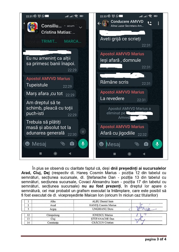 P.S. și ca să răspundem unui mesaj grobian, absolut insultator și lipsit de orice eleganță din partea „unui distins veteran si administrator al conturilor golite” și doar din considerentul de a nu se crede că nu l-am observat dacă nu dăm curs insultelor și calomniilor aberante lansate împotriva noastră, vă asigur că doamna avocat Iuliana Wolf Cosma este un avocat pledant profesionist, cu peste 20 de ani de experiență în domeniu, bine pregătit profesional, atent la detalii și ancorat în realitate. Tocmai această înclinare spre detaliu mi-a permis să sesizez instanței cum ați inserat alte 8 semnături după semnarea și comunicarea Procesului – Verbal din 26.02.2022 (de parcă nu ajungeau multiplele nereguli și neconcordanțe). Și sincer, nu v-ați așteptat, NICIODATĂ să fim prezenți și să înțelegem mașinațiuniile dumneavostră.