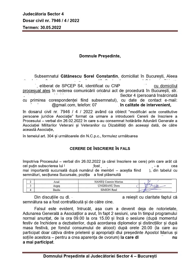 Dl Cătănescu Sorel, prin avocatul ales, Iuliana Cosma Wolf, a redactat o cerere de intervenție prin care a semnalat multiple nereguli in consemnările procesului verbal al adunării generale care face obiectul cererii de înregistrare a modificărilor in Registrul Asociațiilor si Fundațiilor, survenite în urma desfășurării Adunării Generale a Asociației Militarilor Veterani și Veteranilor cu Dizabilități.